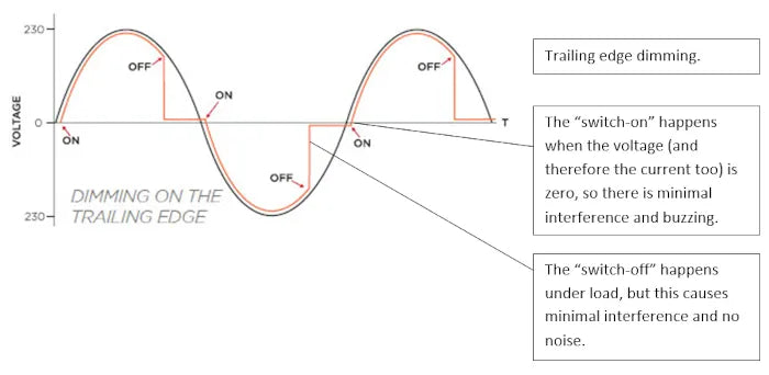 • Leading Edge Dimmers (Triac): These switch off at the start of the AC cycle and on again partway through. The longer the “off” time, the dimmer the light.